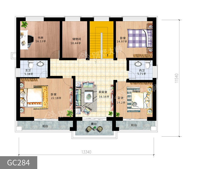 二层:三个卧室,卫生间,储物间,书房,家庭室,露台,阳台