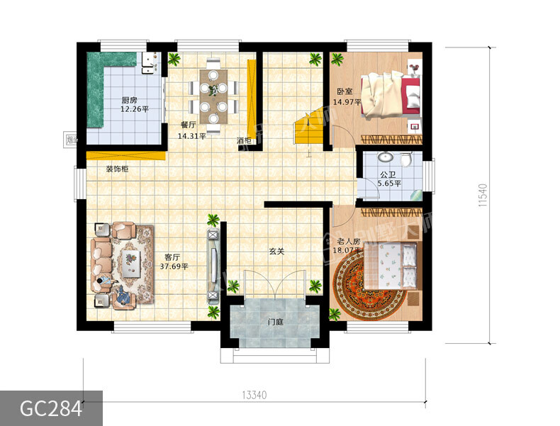 这栋13.34米乘11.54米的农村别墅,虽格局较小却五脏俱全。