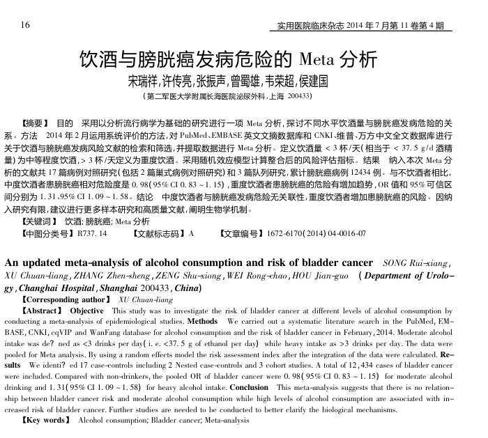 [1]宋瑞祥,许传亮,张振声,等.饮酒与膀胱癌发病危险的Meta分析[J].实用医院临床杂志,2014,11(04):16-22.