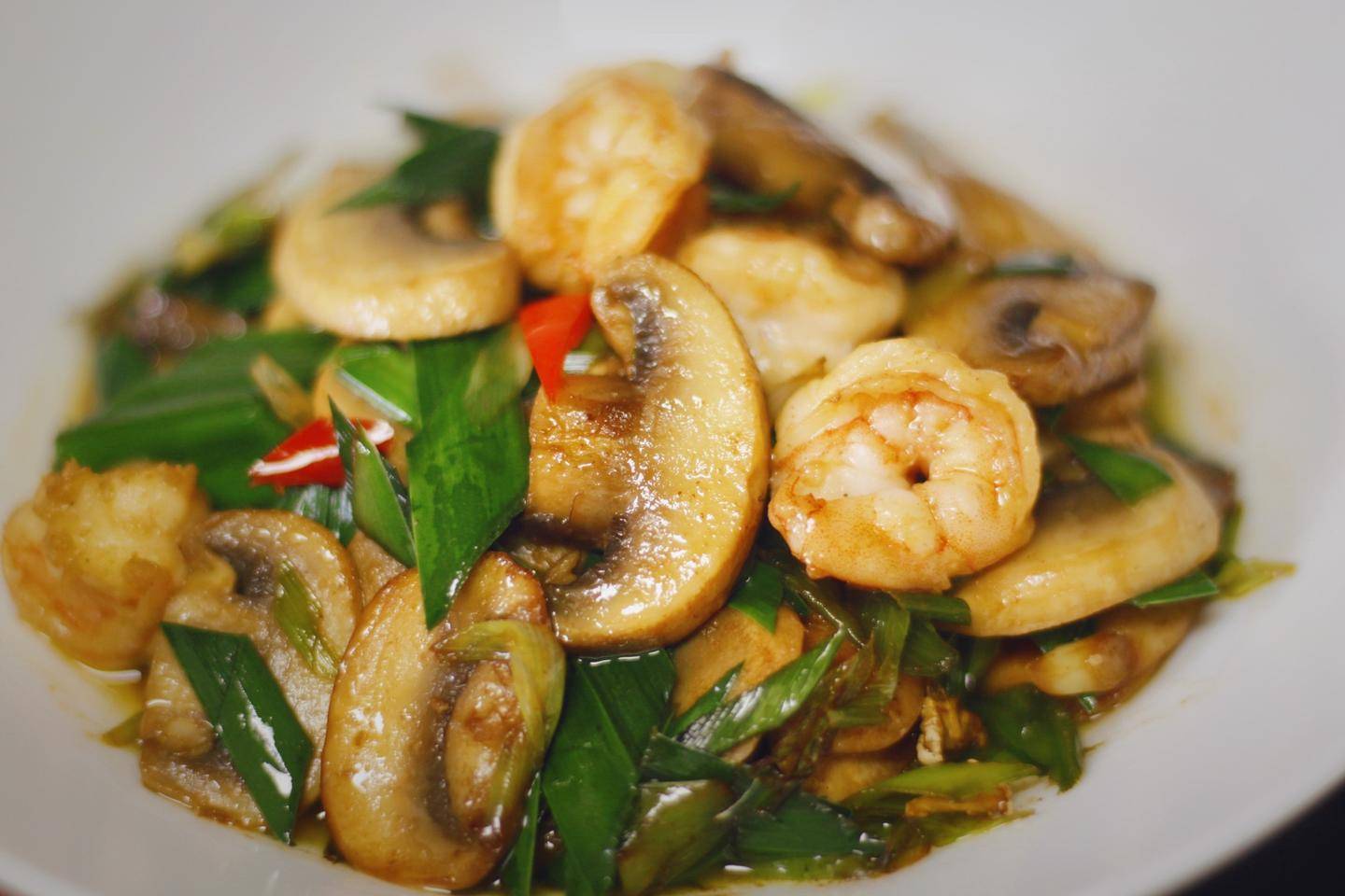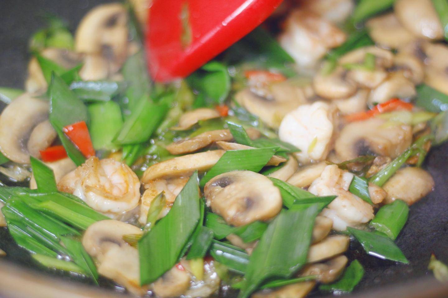 4、接着将其扒拉到一边,将虾仁倒在里边,炒一会儿,直到虾仁变色。同口蘑炒匀,其中烹入生抽,盐,加一把蒜叶,继续炒到全部入味,即可盛出来。