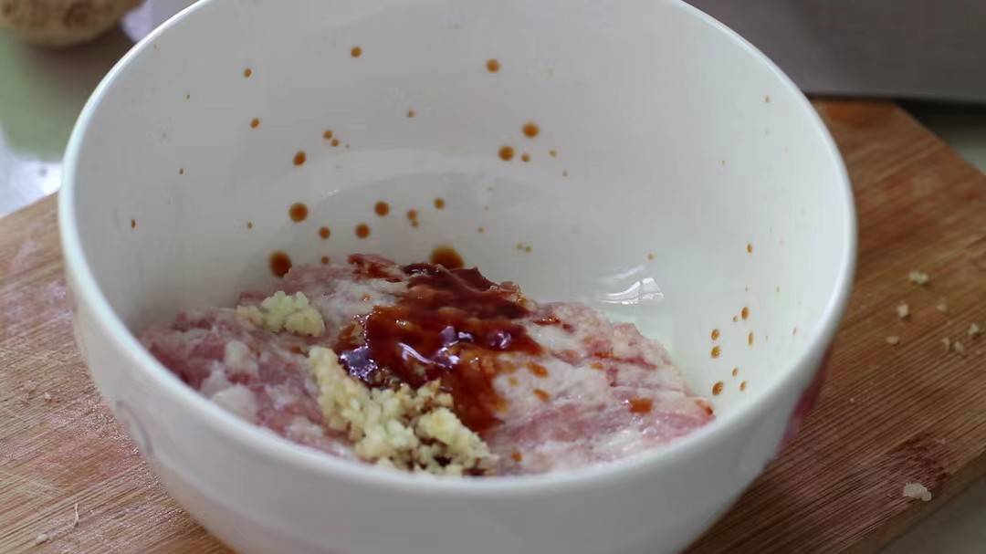 2、一点五花肉,切成小颗粒,加点酱油,姜蓉,搅匀,入个底味。