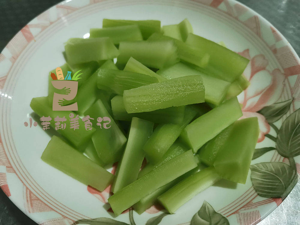 1、新鲜莴笋一根,先将厚片层层削掉,露出嫩嫩的笋肉为止,然后将其切成小块。