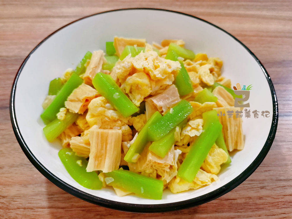 4、接着在其中加葱花蒜蓉,莴笋和腐竹一起倒里边,调入酱油,蚝油,反复炒一会儿,大约一分钟就熟了。届时把鸡蛋再次倒进里边,撒些盐,继续炒入味,马上关火盛出来即可。