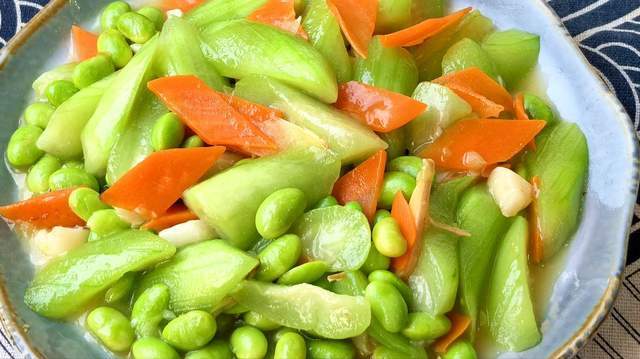 食材:丝瓜 1 根、毛豆 200 克、盐、食用油、大蒜 2 瓣。