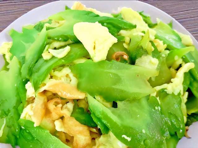 食材:苦瓜 1 根、鸡蛋 3 个、盐、食用油、大蒜 2 瓣。