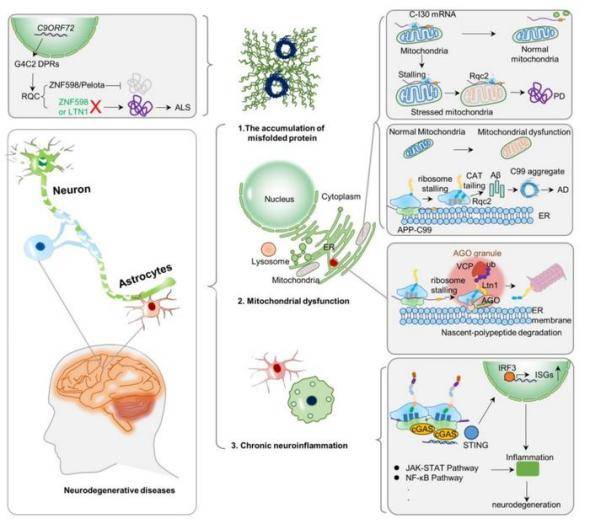 在发病机制研究领域,β-淀粉样蛋白(Aβ)假说和Tau蛋白异常磷酸化是AD的核心理论,而PD则以α-突触核蛋白(α-syn)聚集为标志。近年来,核糖体相关蛋白质量控制(RQC)通路成为研究热点,其功能失调与蛋白质毒性积累直接相关,为治疗靶点开发提供新方向。