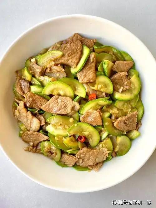 3、起锅烧油滑熟瘦肉捞出,留底油炒香蒜、小米辣,放西葫芦炒断生,再放瘦肉和料汁翻匀出锅。