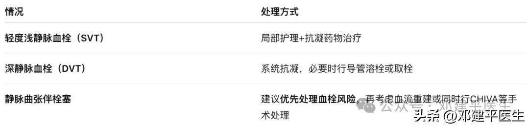 早期(2周内)局部的浅静脉血栓,可同时采取CHIVA治疗静脉曲张和取出血栓,控制血栓风险的同时保留功能性静脉,避免不必要的剥除。