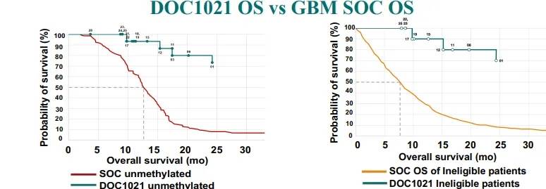 值得一提的是,DOC1021并非仅在胰腺癌治疗领域崭露头角。此前,它已凭借出色的临床数据,先后获得FDA授予的快速通道和孤儿药资格,用于治疗多形性胶质母细胞瘤(GBM)。在2024年美国癌症研究协会(AACR)年会上公布的1期开放标签研究中期数据令人眼前一亮:16例新诊断的GBM患者,在平均随访12.9个月后,中位总生存期尚未达到,12个月中位生存率高达88%,相比之下,接受标准治疗的GBM患者中位总生存期仅为12.7个月。这一显著差异,充分彰显了DOC1021在对抗GBM方面的强大实力。