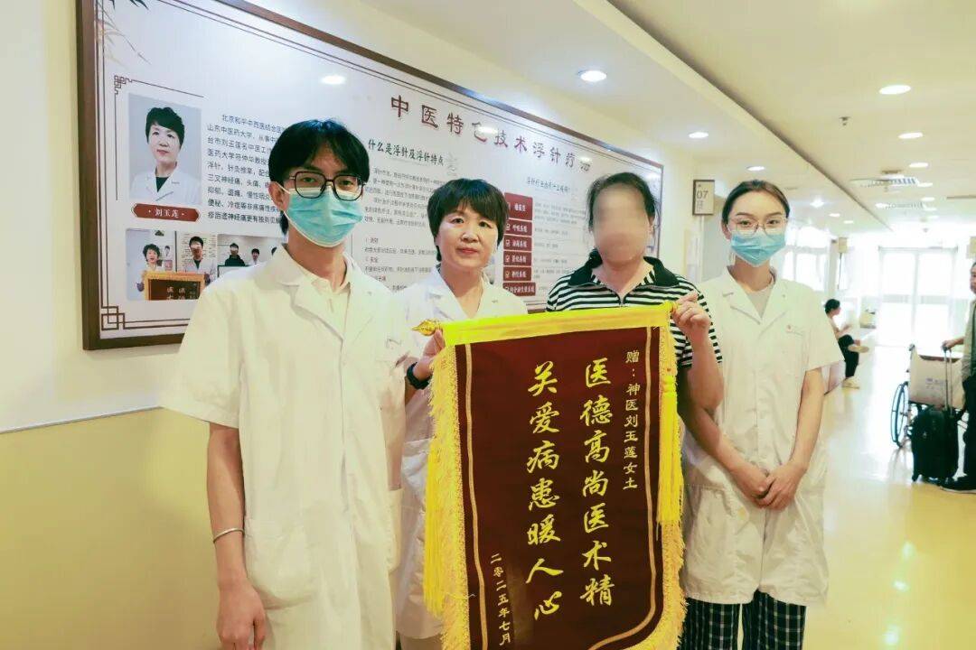 2025年9月的一个清晨,五十二岁的王女士将一面绣着"医德高尚医术精,关爱病患暖人心"的锦旗,郑重交到和平中西医结合医院疼痛科刘玉莲主任手中。锦旗的金色流苏在晨光中微微颤动,像极了王女士颤抖的双手——这双手曾因腰椎间盘突出症连筷子都握不住,如今却已能稳稳托起这份沉甸甸的谢意。