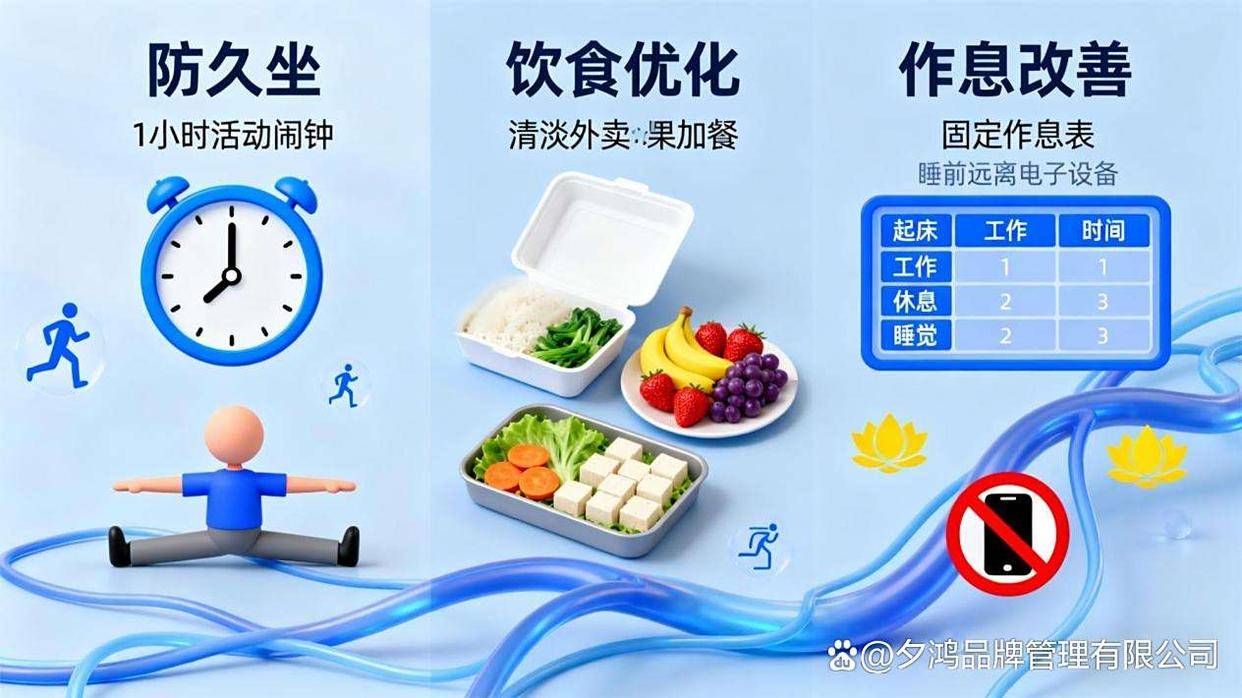 2. 饮食优化:外卖选择清淡菜品,自带水果作为加餐,保证每日蔬菜摄入