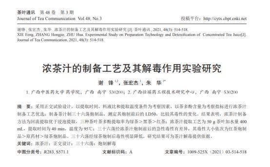 谢锋 , 张宏杰 , 朱华 . 浓茶汁的制备工艺及其解毒作用实验研究 [J]. 茶叶通讯 ,2021,