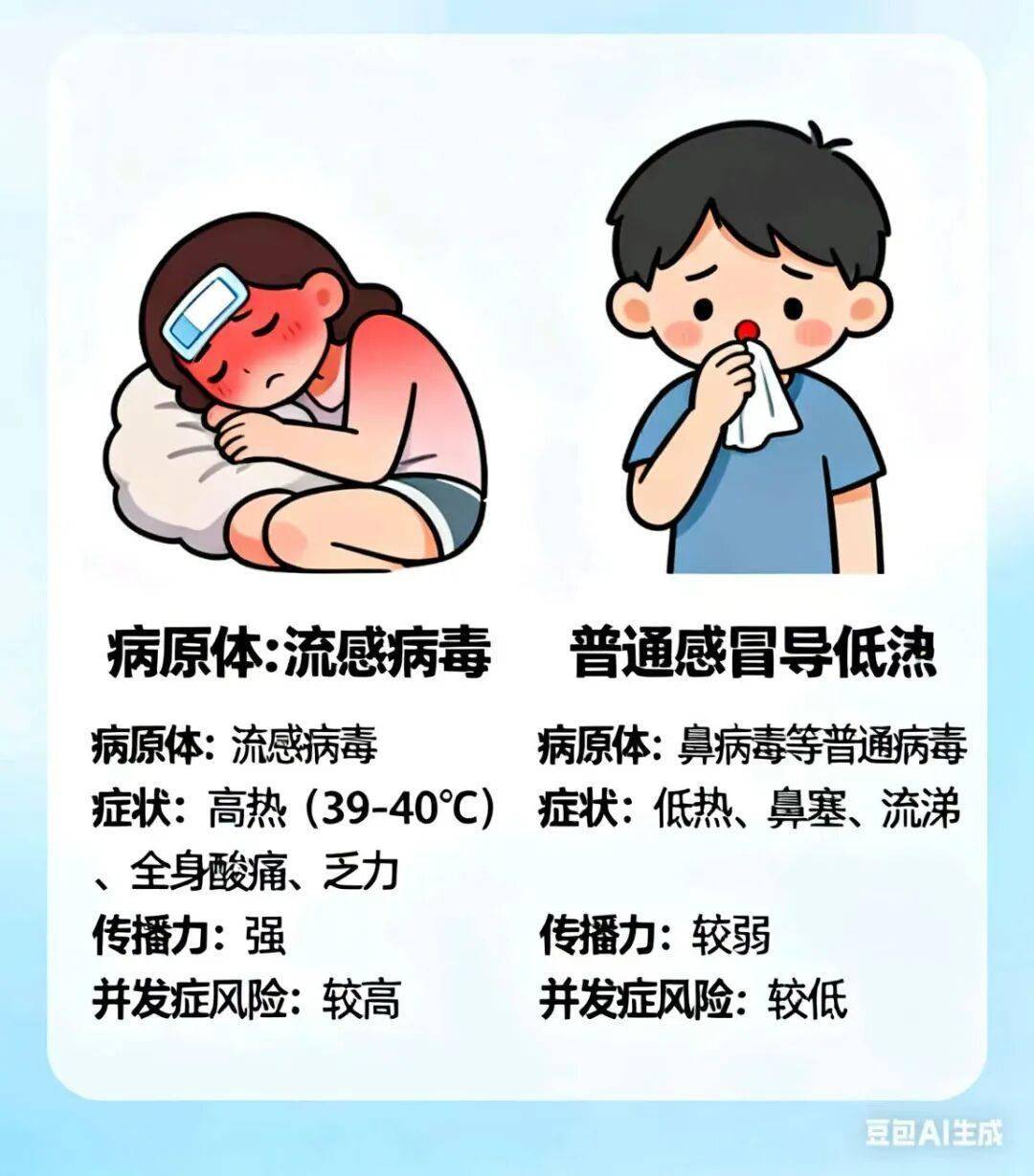 ※症状差异大:流感起病急,常突发39-40℃高热,伴有寒战、全身酸痛、乏力等全身症状,发热可持续3-5天;普通感冒多为低热,以鼻塞、流涕、咽痛等局部呼吸道症状为主,1-2天即可好转。