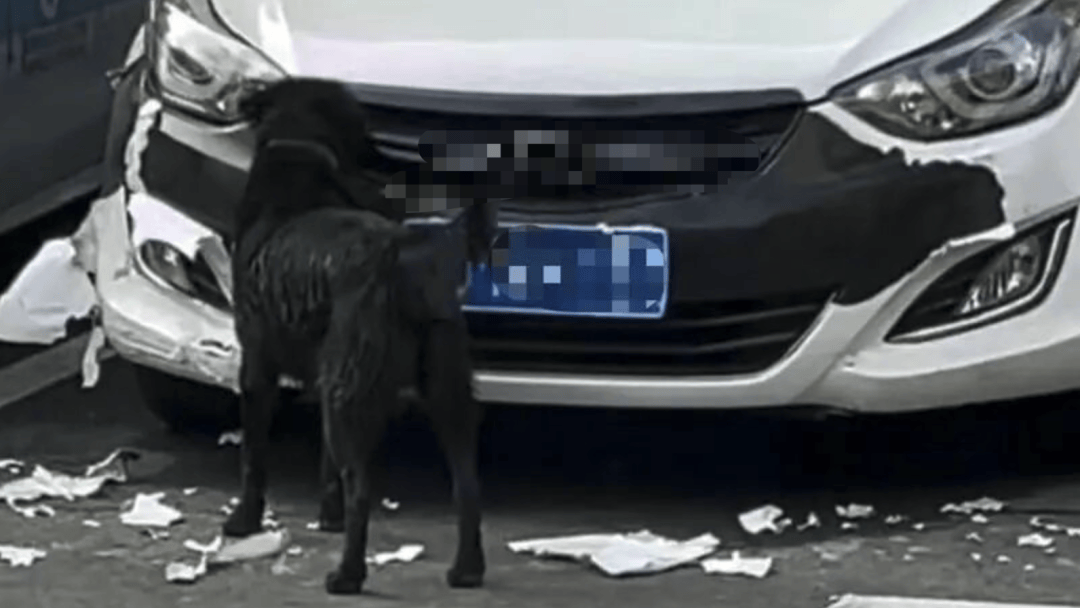 挂断电话后,马女士第一反应是遭遇诈骗,但出于谨慎还是赶往停车场查看。抵达车位时,眼前的场景让她又惊又气——自己的白色私家车前方车衣被撕得粉碎,散落一地,车身布满口水与牙齿印,一旁还站着一只戴着项圈的黑狗。
