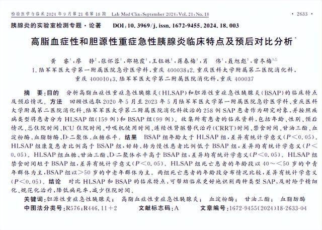 黄睿.高脂血症性和胆源性重症急性胰腺炎临床特点及预后对比分析, 检验医学与临床 ,2024-09-26