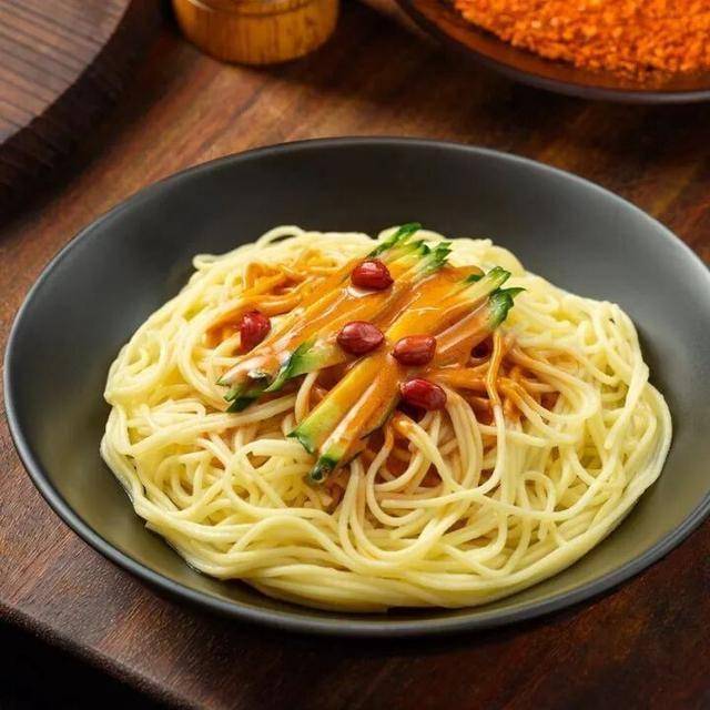 麻酱黄瓜丝拌面(面条100克、黑芝麻酱5克、黄瓜50克、心里美萝卜30克)