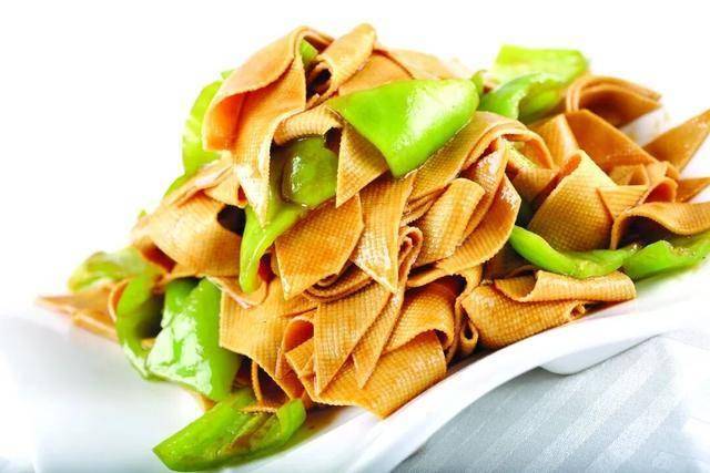 尖椒炒豆腐皮(尖椒50克、豆腐皮20克)