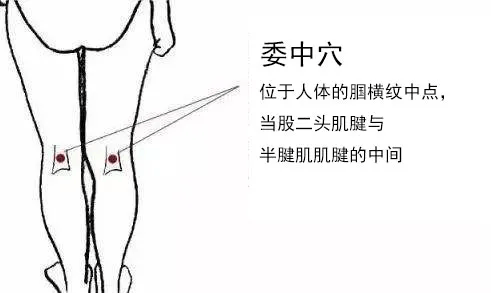 腘窝中心点有一个重要穴位——委中穴,它位于膀胱经上,而膀胱经是人体最大的排毒祛湿通道,委中穴就是这个通道上的一个排污口,膀胱经膝下部各穴上行的水湿之气在此聚集;经常拍打这个穴位,有升清降浊、快速排湿的作用。