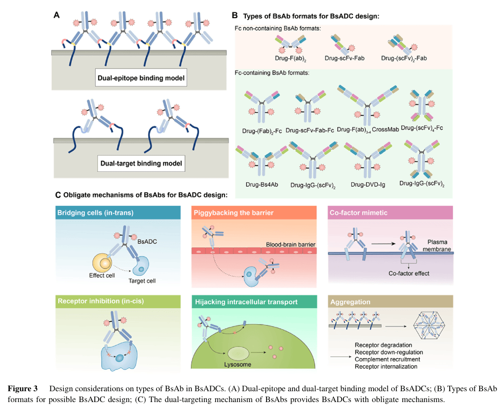 图 3 里能看到 BsAb 的不同格式,以及 “搭桥跨屏障”“劫持运输” 等特殊机制,这些都跟抗体格式、连接子 - 载荷的设计有关。