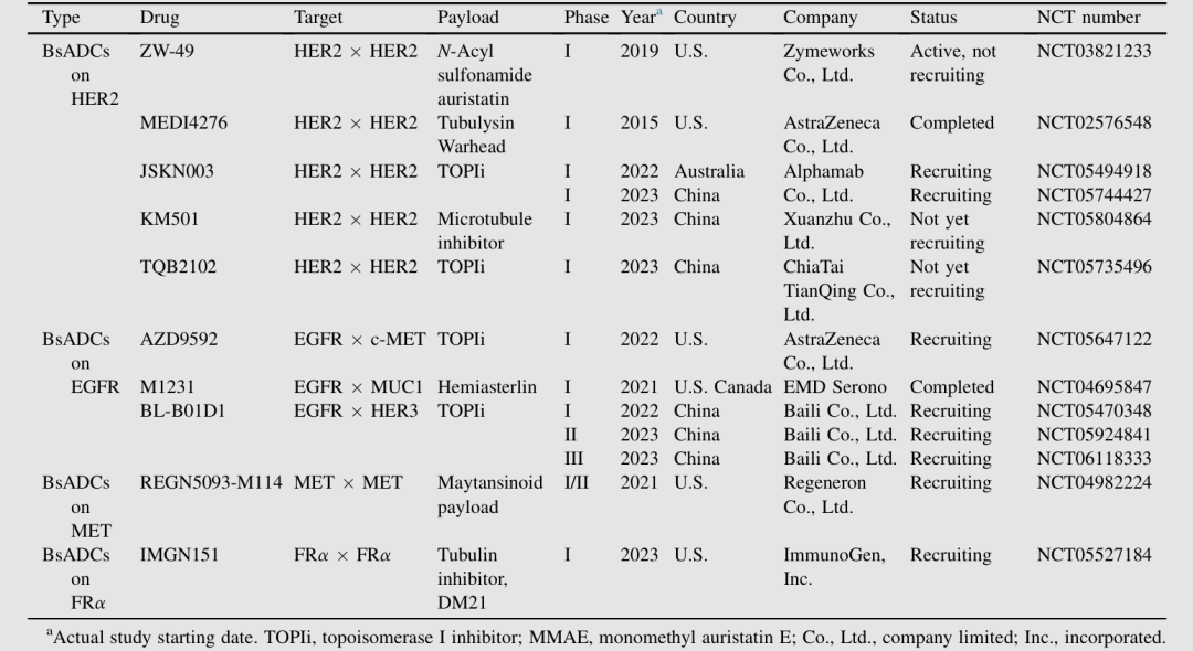 表1:目前处于临床试验阶段的 BsADCs
