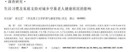 [1]冯玉如,周立芝.生活习惯及家庭支持对城乡空巢老人健康状况的影响[J].中国老年学杂志,2017