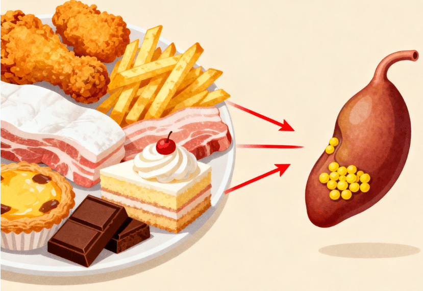 假期聚餐多,油炸食品、肥肉、动物内脏、甜腻点心频繁上桌。这类食物刺激胆囊剧烈收缩,若有结石易导致移位梗阻,引发胆绞痛;高糖饮食还会加速肝脏合成胆固醇,可能让结石增大或催生新结石。