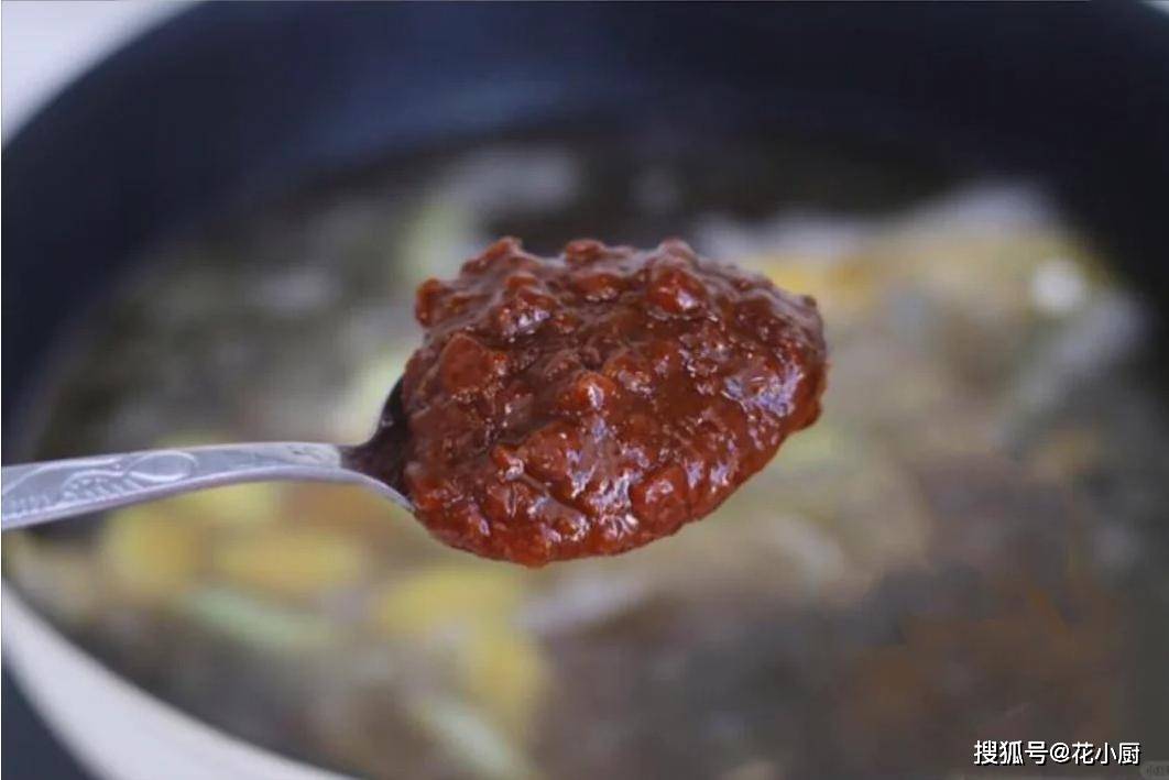4、把北豆腐切成小方块,一股脑全加到汤里,再放点盐和黄豆酱进去,开大火把汤烧开。