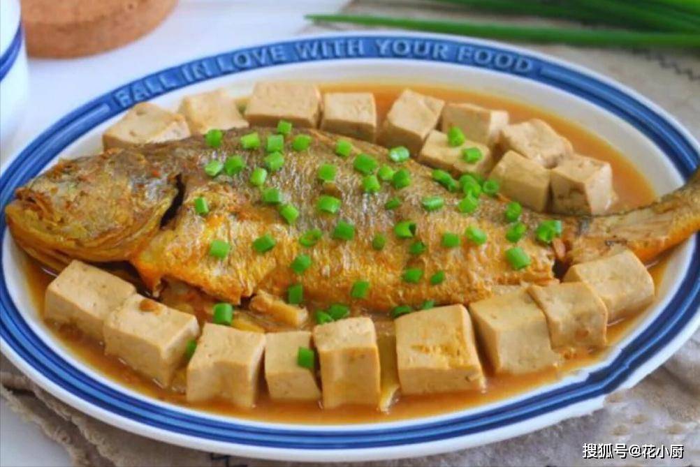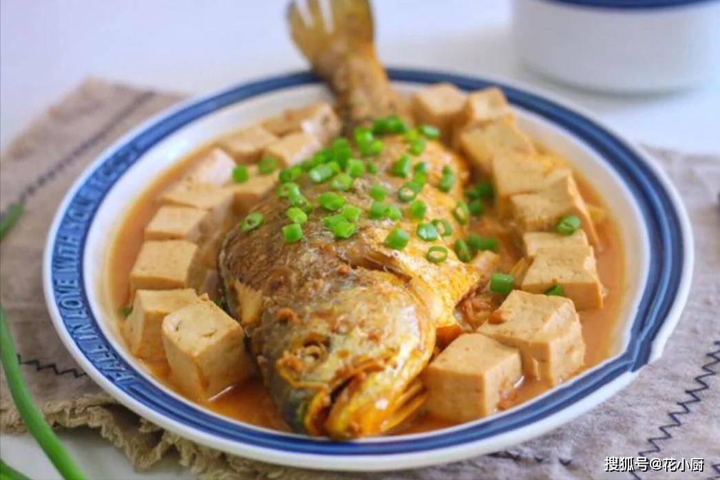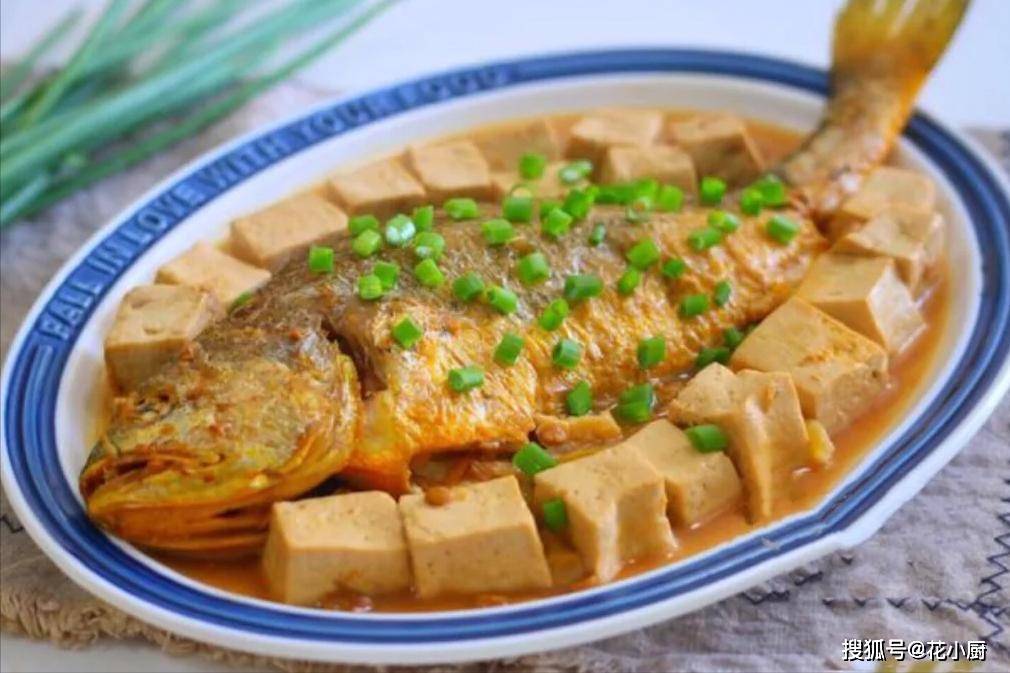 食材:黄花鱼1条(450克)、北豆腐1块儿、黄豆酱2汤匙、鲜酱油2汤匙、葱姜蒜各5克、油盐适量、香葱1棵