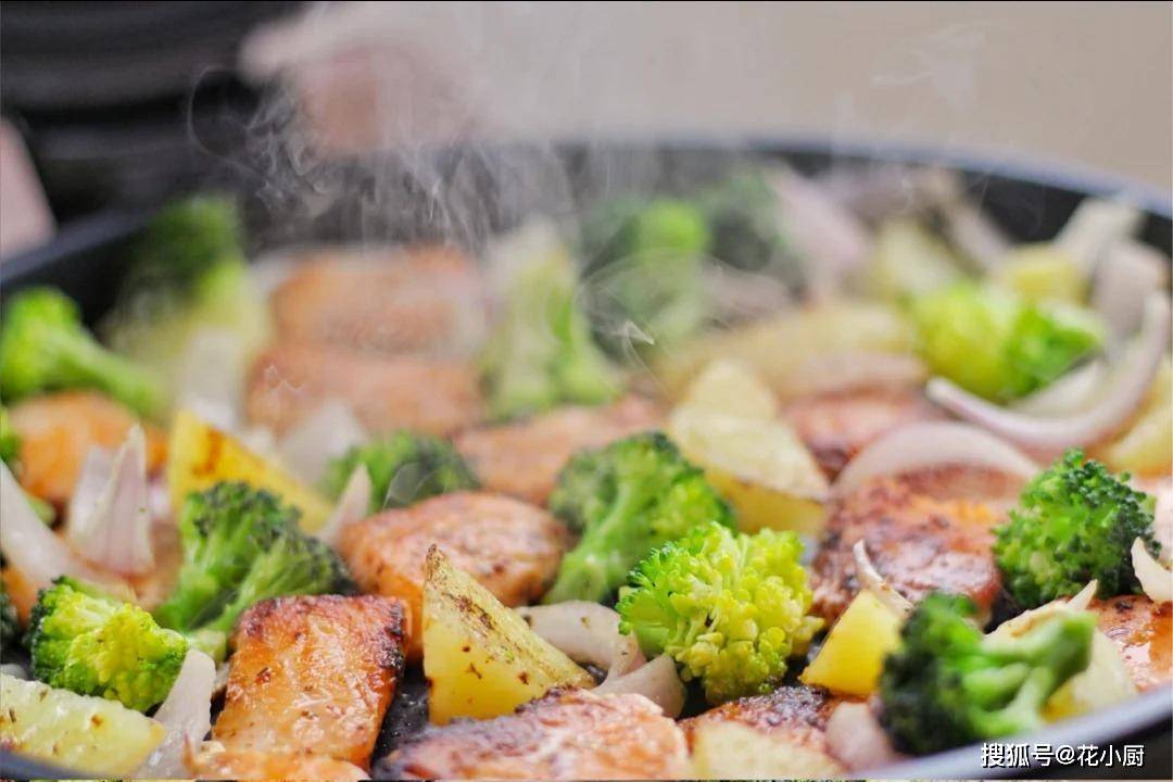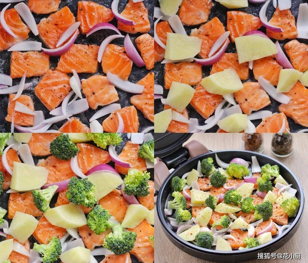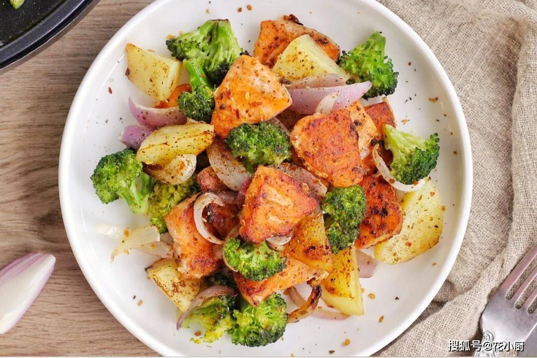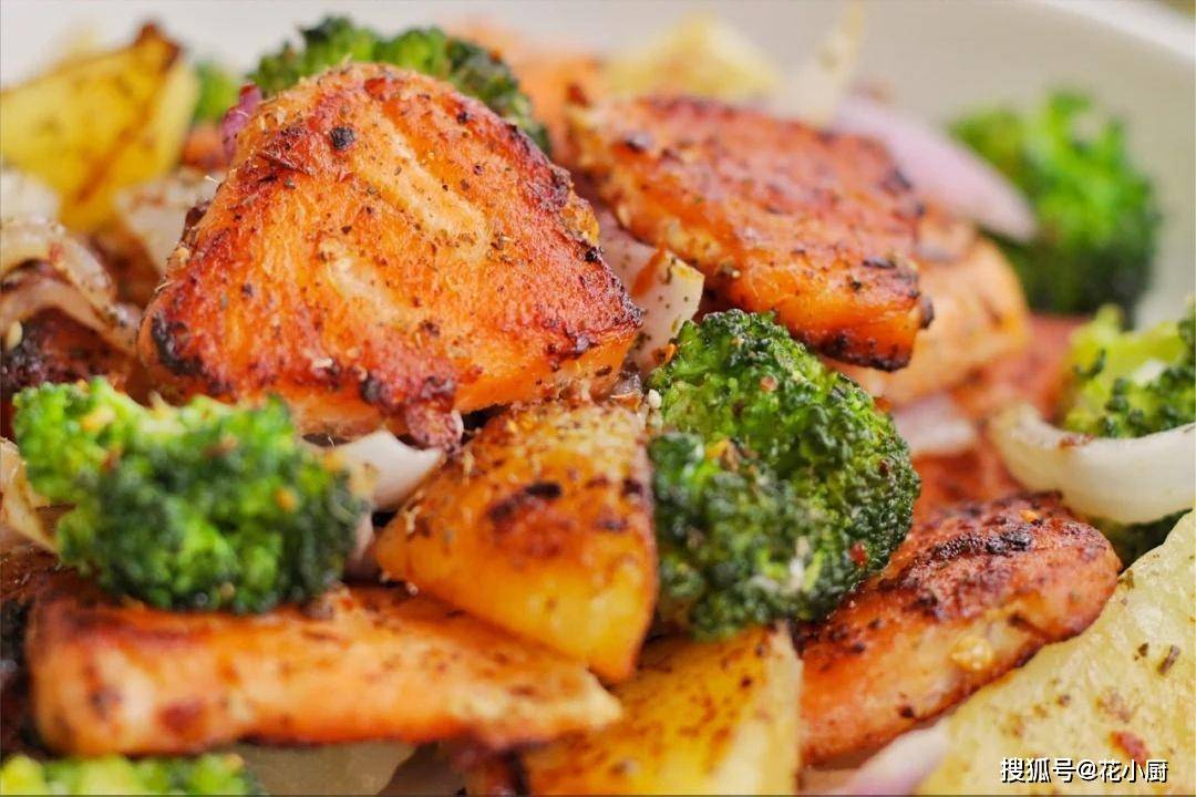 三文鱼的外皮烤得金黄酥脆,里面鲜嫩多汁。西蓝花、洋葱、土豆也都吸收了三文鱼和黄油的香味,变得超级好吃。