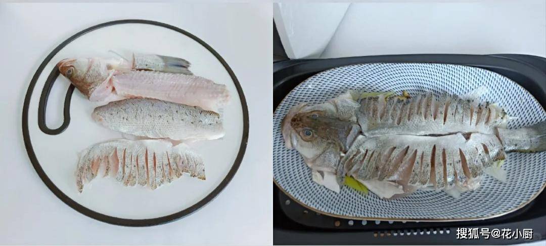 4、咱把海鲈鱼的鱼头鱼尾处理一下,然后把鱼切成小段。切好之后,把鱼段码在盘子上,在下面垫上葱段和生姜片,再撒半勺盐,倒一勺料酒。这就跟给鱼做个 “按摩”,让它提前吸收点味道。