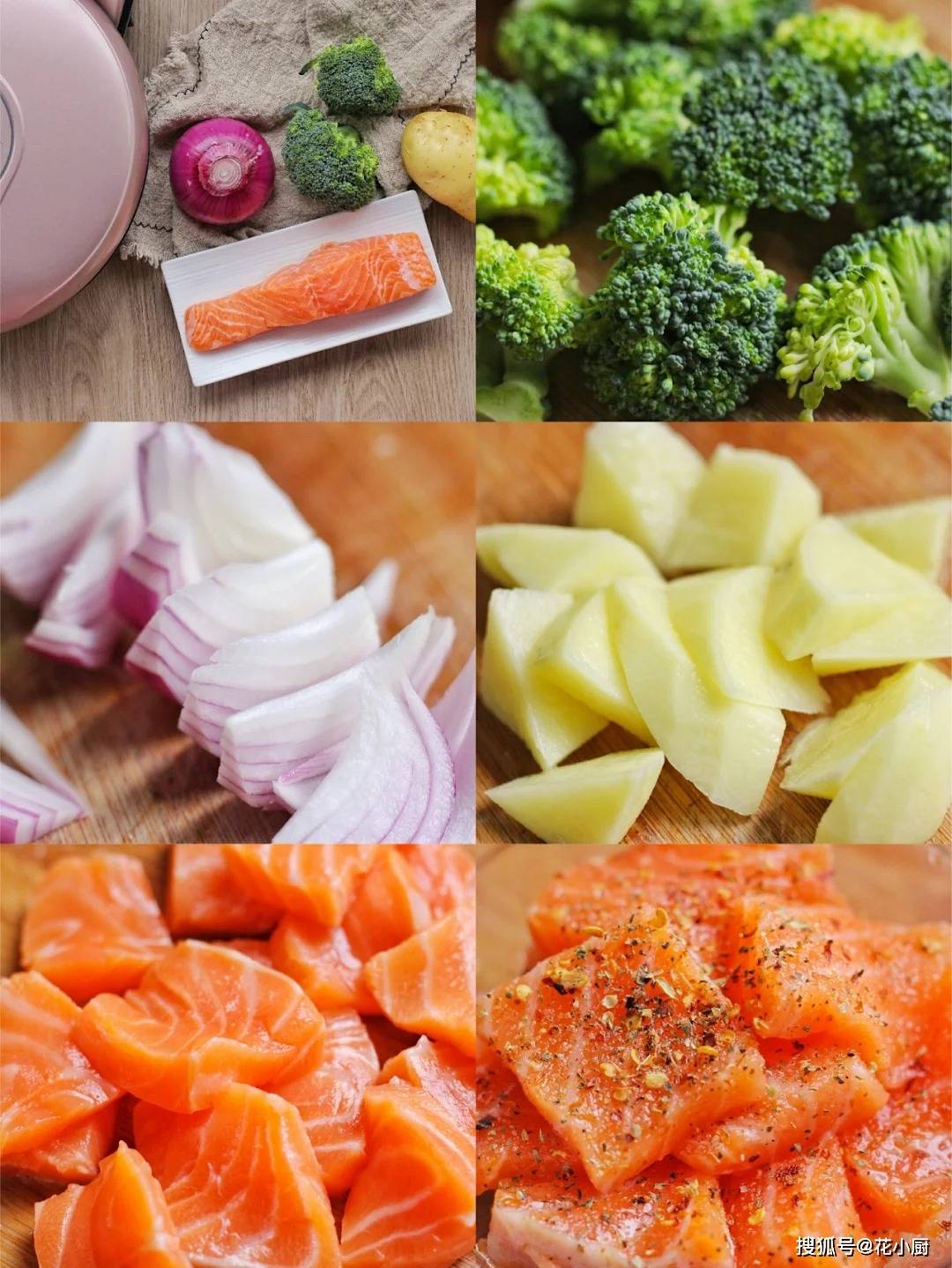 食材:三文鱼得要 200 克、西兰花来个 100 克、洋葱也 100 克、土豆稍微多来点,150 克、 15 克黄油、2 克黑胡椒粉、2 克海盐、1 克辣椒粉