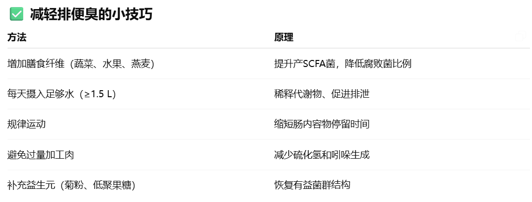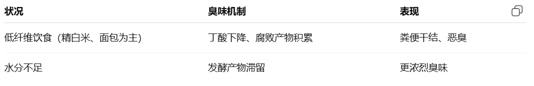纤维不足时,产丁酸菌减少、肠道pH升高 → 腐败菌优势 → 气味增强。