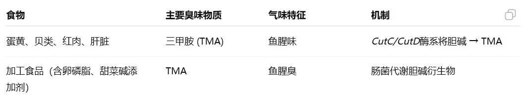 这些可被菌群代谢为 三甲胺(TMA),散发鱼腥臭味。