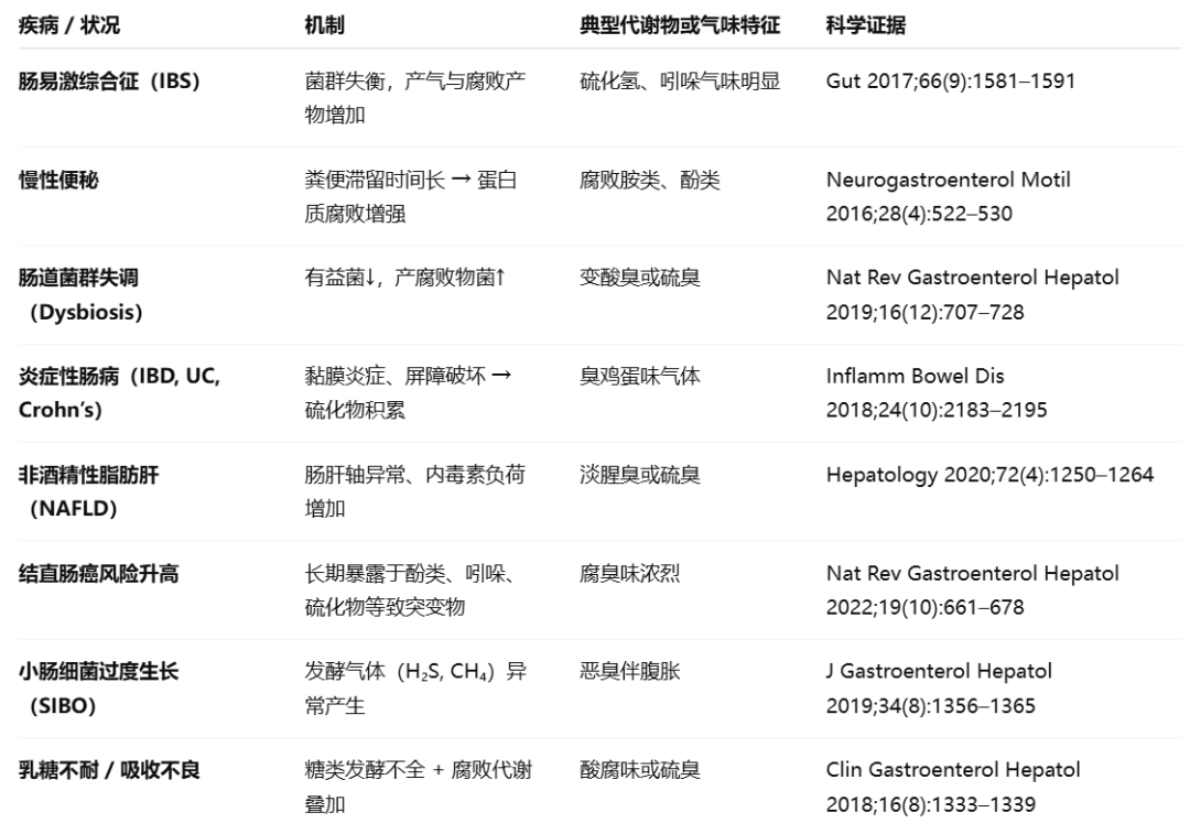 研究发现,结直肠癌、炎症性肠病、肠易激综合征、非酒精性脂肪肝等疾病都与长期排便臭有关联。