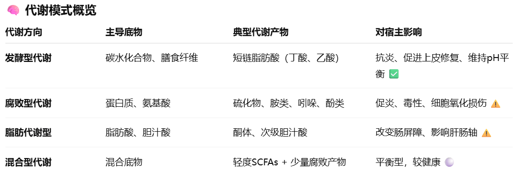 腐败型代谢(putrefactive metabolism)指肠道菌群在缺乏可发酵碳源(如膳食纤维)的情况下,主要以蛋白质及其分解产物(氨基酸)为底物,通过厌氧发酵进行能量代谢的过程。这一过程会生成多种含氮、含硫或芳香族代谢物,许多具有强烈不愉快的刺激性气味,甚至是神经性毒气。