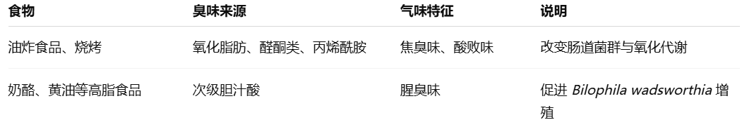 高脂食物促进产胆汁酸菌与腐败菌繁殖,油炸食物会生成氧化脂肪和丙烯酰胺,加重臭味。