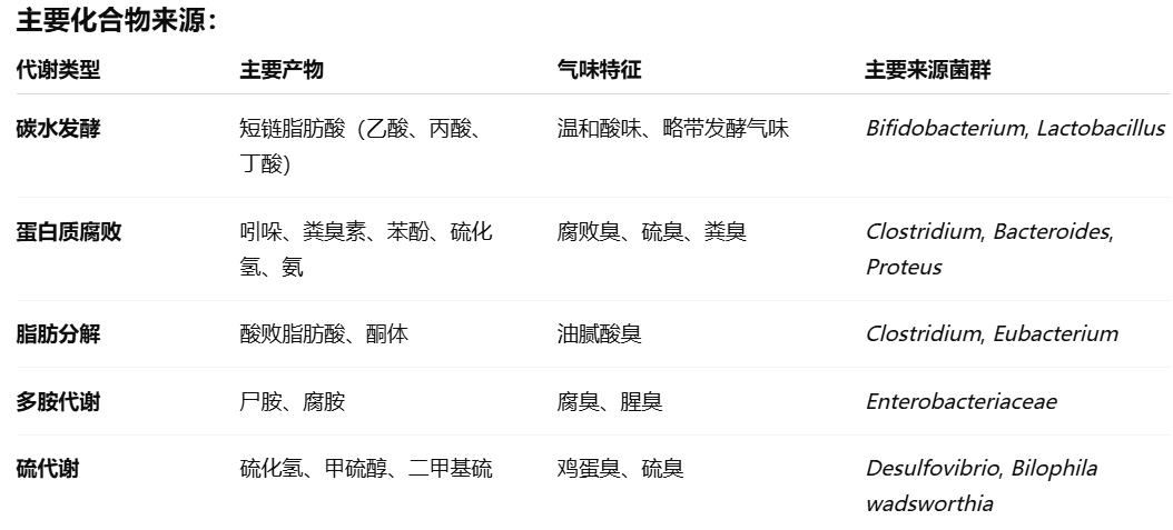 粪便气味并非人体固有,也不是吃的东西所具有,其根本来源是肠道细菌对所进食的食物的代谢产物。人体自身排出的食物残渣、胆汁酸、黏液等本身几乎无味,真正的气味来自于微生物分解食物残余后的挥发性化合物(Volatile Organic Compounds, VOCs)。