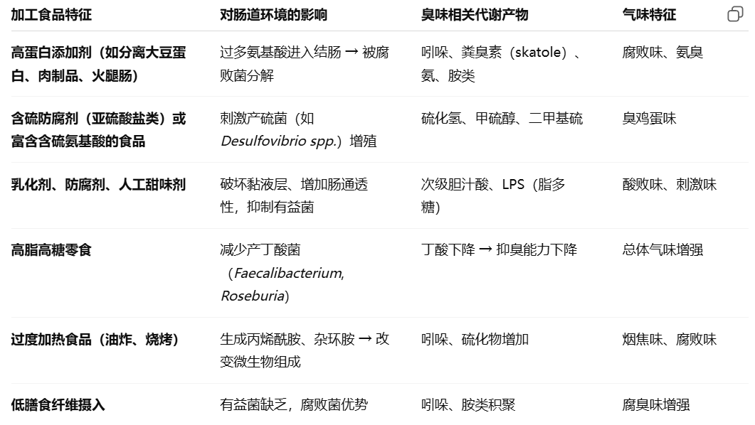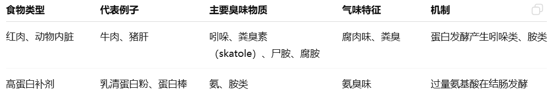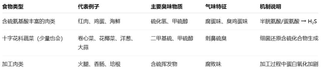 这些食物可被产硫菌(如 Desulfovibrio spp.)代谢成硫化氢(H₂S)、甲硫醇等强烈臭气分子。