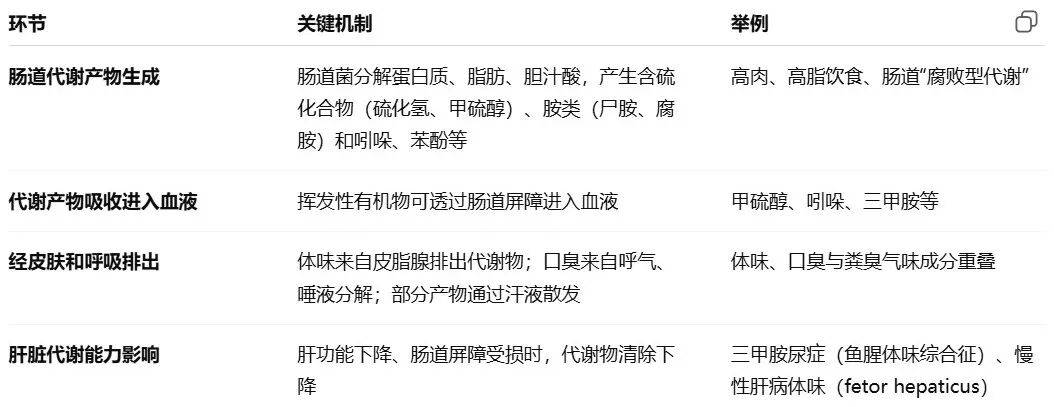 肠道产生的臭味物质可透过肠道屏障进入血液,体味、口臭与粪臭的气味成分有明显重叠。