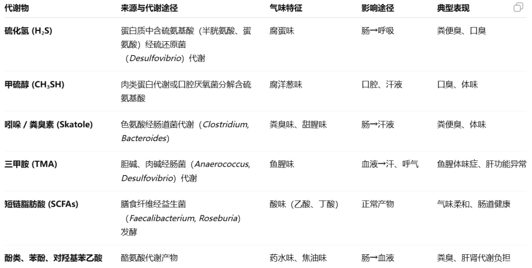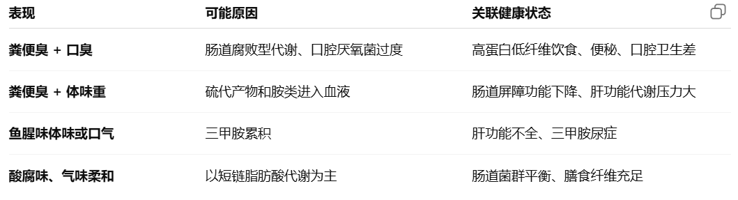 排便臭、体味、口臭在一定程度上相互关联,共同反映了体内代谢产物累积和肠道-肝脏-皮肤-呼吸道代谢轴的状态。