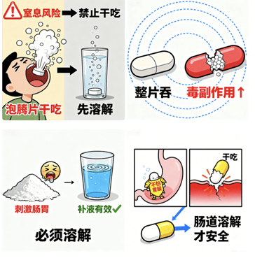 粉剂冲服莫干吞,泡腾片剂忌直咽