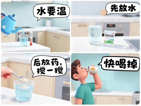 先放水:水量要适宜,如3克一袋的药粉需倒入50毫升温开水中服用。水量太多会被稀释影响药效,水量太少容易结块引起便秘。