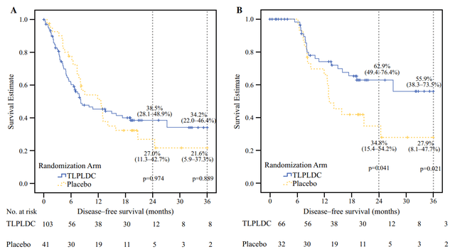 共144例患者随机分配至疫苗组(103例)和对照组(41例)。结果显示:24个月无病生存率分别为38.5%和27.0%,估计的36个月无病生存率分别为34.2%和21.6%。24个月总生存率TLPLDC组为86.4%,对照组为75.1%,36个月总生存率TLPLDC组中为67.8%,在对照组中为49.3%。