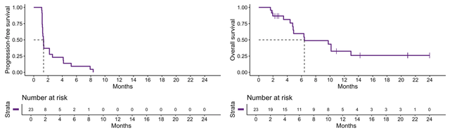 23例患者中有22例(95.7%)出现了无进展生存期(PFS)事件。中位无进展生存期为1.4个月。6个月时的无进展生存率为9.2%;6个月、12个月和18个月时的总生存率分别为59.6%、32.5%和26.0%。