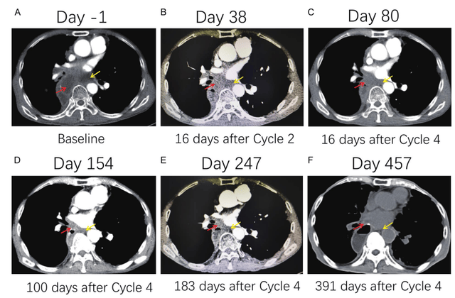 该患者于2011年1月接受根治性食管切除术,2020年7月,发现食管癌复发伴纵隔淋巴结转移。于是患者接受mRNA疫苗治疗,第4周期后病变短轴总和减少36.4%,从51mm减少到29mm,患者实现部分缓解(PR),停止疫苗治疗38周后,肿瘤仍在继续缩小。