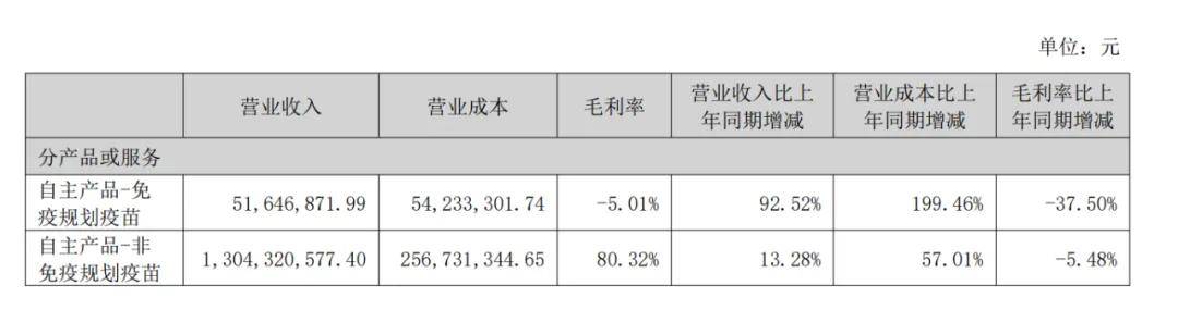 康泰生物的业务主要分为非免疫规划疫苗(二类疫苗)和免疫规划疫苗。后者占比虽较小,上半年营收仅5164.7万元,但营业成本却同比上升了近200%,毛利率下滑37.5%至负数。这也在一定程度上反映了疫苗市场竞争的激烈。