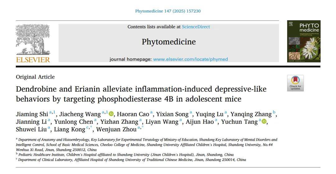 Shi J, Wang J, Cao H, et al. Dendrobine and Erianin alleviate inflammation-induced depressive-like behaviors by targeting phosphodiesterase 4B in adolescent mice[J]. Phytomedicine, 2025: 157230.