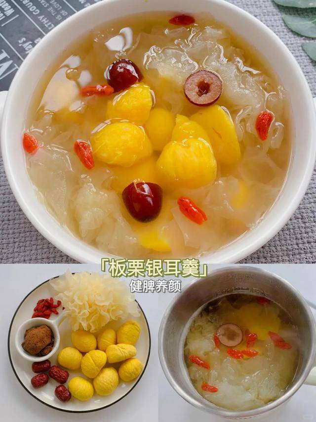板栗是秋季的应季食材,搭配红枣和银耳,有健脾养胃的功效。这款汤羹带着板栗特有的香甜,为微凉的秋天增添暖意。