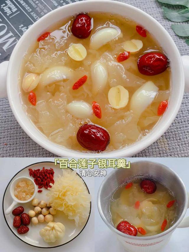 做法:银耳洗净撕小片,与莲子、红枣一起放入养生壶煮20分钟;出胶后放入洗净的百合、冰糖煮5分钟;最后加入枸杞再煮1分钟即可。