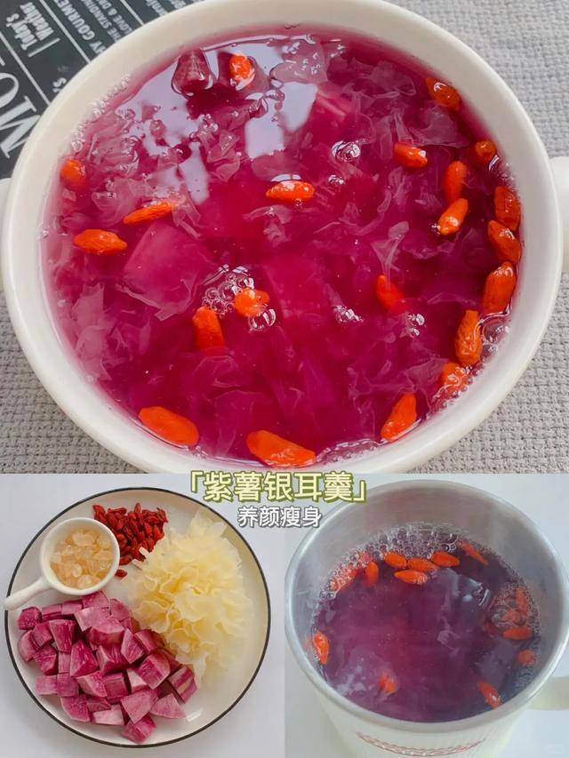 做法:银耳和紫薯一同放入养生壶煮20分钟;出胶后加入冰糖再煮5分钟;出锅前放入枸杞即可。